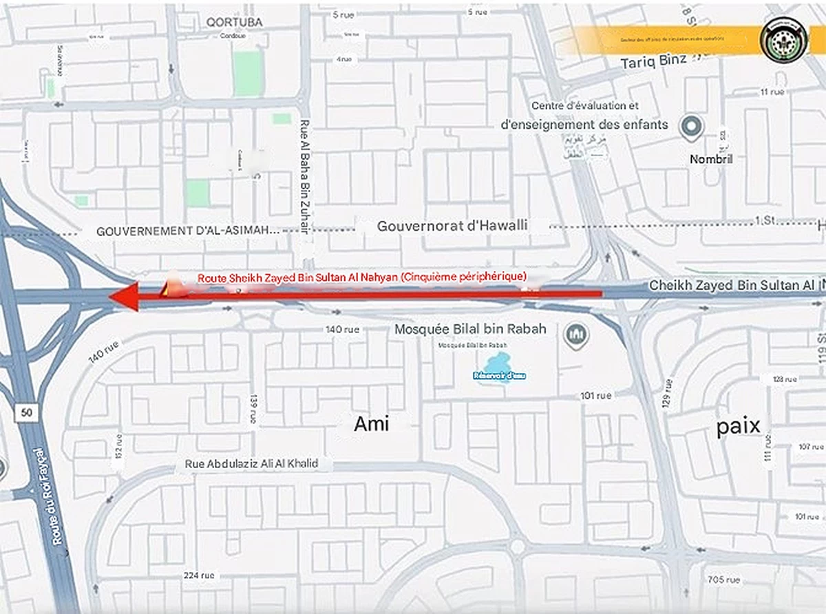 KUWAIT CITY, Jan 24: The General Traffic Department has announced the temporary closure of the right lane, slow lane, and middle lane on Sheikh Zayed Bin Sultan Al Nahyan Road (Fifth Ring Road) heading towards Al Jahra, opposite the Qurtuba area, as part of ongoing road development works.