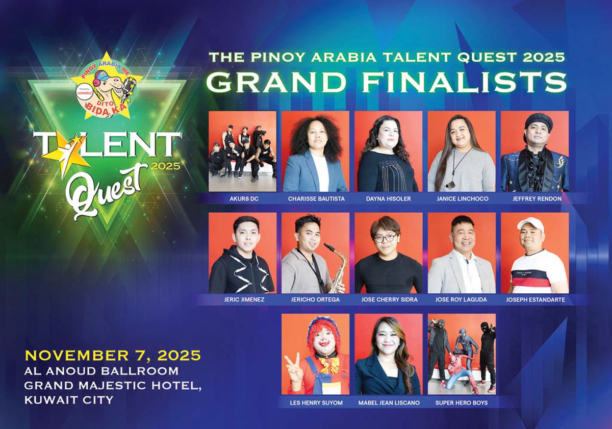 KUWAIT CITY, Nov 5: A total of 13 talented Filipinos in Kuwait will battle it out in the Pinoy Arabia Talent Quest 2025 Grand Finals on November 7, 2025 at the Grand Majestic Hotel. The Talent Quest is one of the major highlights of the Pinoy Arabia Barrio Fiesta 2025, marking the 11th Anniversary celebration of Pinoy Arabia, the leading and only Filipino online radio station and only Filipino social media platform duly licensed by the Kuwait Ministry of Information.