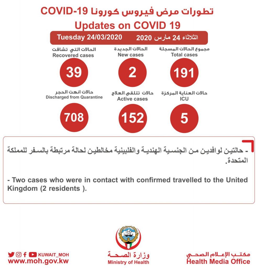 During a press conference, the ministry's spokesperson Dr. Abdullah Al-Sanad said that the two cases are related to a Filipino and an Indian residents who were in contact with patients that arrived from the UK, bringing the number of infections in the country to 191 cases.