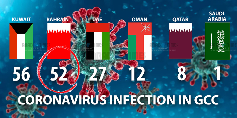 KUWAIT CITY, Mar 04: The Bahrain News Center revealed today, Wednesday, that 3 new cases of Coronavirus had been detected in the country. The center said that the total number of people infected with coronavirus in the Kingdom of Bahrain rose to 52 people after registering the new infections. The Bahraini authorities suspended the study for two weeks, earlier, and called on citizens not to travel to countries where the virus has spread, such as Iran, Italy, Thailand, Singapore, Malaysia and South Korea.