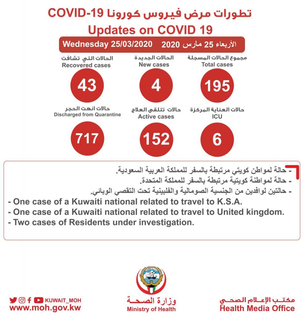 KUWAIT CITY, Mar 25: Kuwait confirms 4 new coronavirus cases during the past 24 hours, said the Health Ministry on Wednesday, bringing the number of infections in the country to 195 cases.