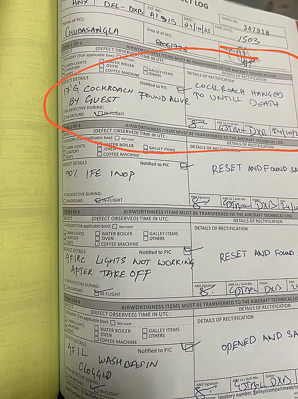 A passenger, seated on 17 G seat, reportedly spotted a live cockroach scuttling down the aisle, sparking surprise and disgust in equal measure. What followed next was something no one could have scripted. A cabin crew member, adhering to the airline’s procedures, recorded the incident in the official cabin defect logbook — but in a way that has since sent social media into a frenzy.
