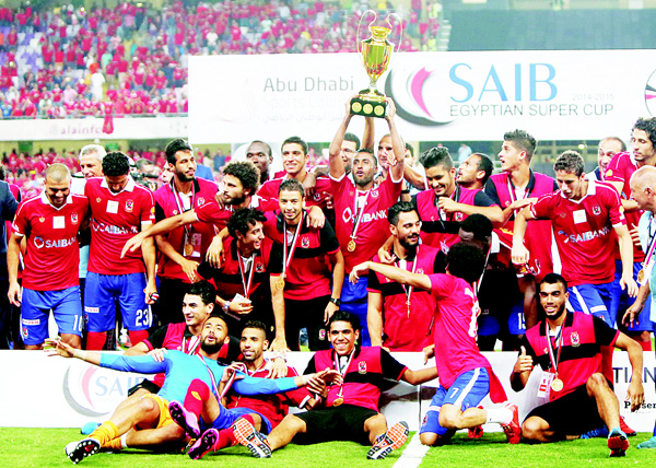 Egypt’s Al-Ahly’s players celebrates with their trophy after winning the Egypt super cup football match against Egypt’s Zamalek on Oct 15, at Sheik Hazza Bin Zayed Stadium in Al-Ain, UAE. (AFP)Al-Ahly SC, the champions of 2015 Egypt Cup, have been crowned as champion of the ninth Super Cup of Egypt after defeating Al-Zamalek 3-2 on Thursday night.