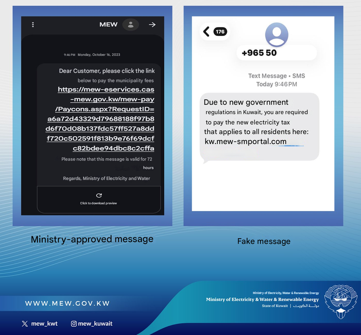 KUWAIT CITY, Nov 21: The Ministry of Electricity, Water, and Renewable Energy has issued an official statement warning the public about fraudulent text messages that have been circulating recently. These messages, which falsely claim to request payment of electricity bills via unknown links, are not issued by the Ministry and have no official connection to it.