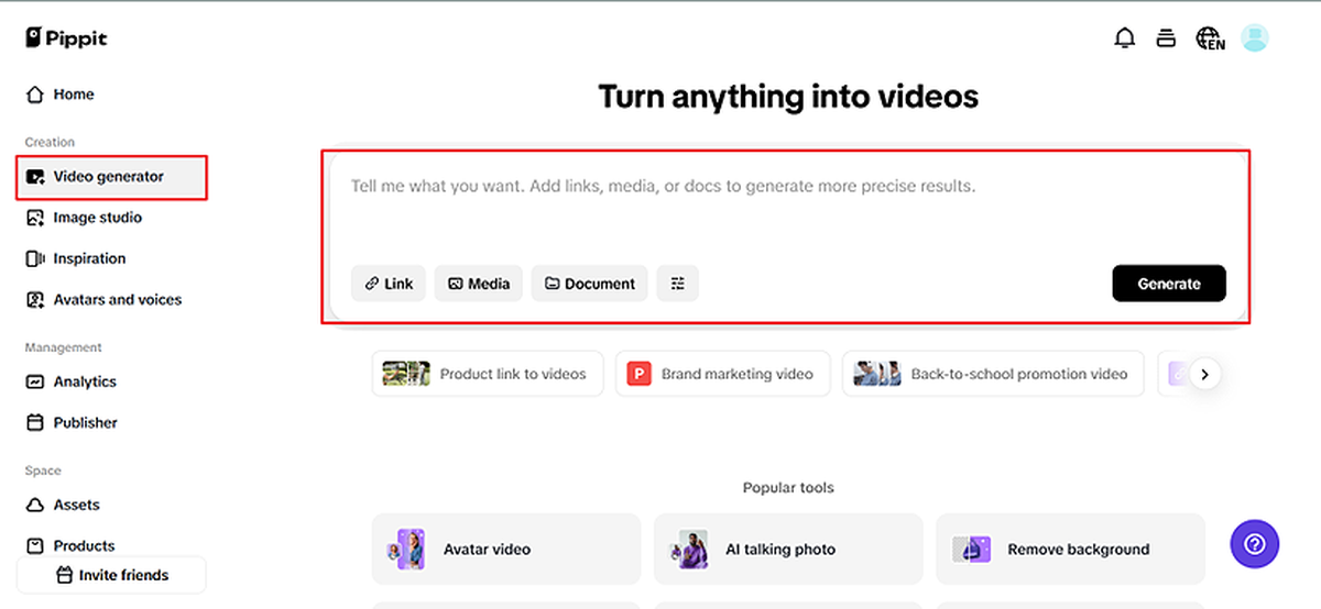 Begin by going to the 'Video Generator' on Pippit's website. Enter the link to your product, and Pippit will use its AI technology to create your ad base automatically.