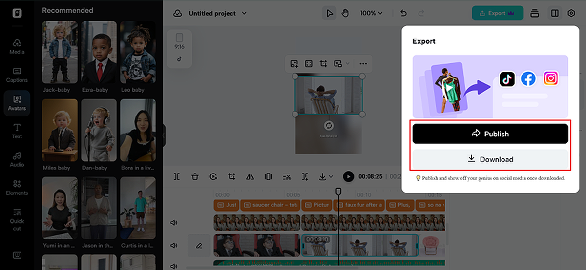 After you're satisfied, click Export. Pick the format and resolution you want; Pippit works with widescreen YouTube and TikTok.