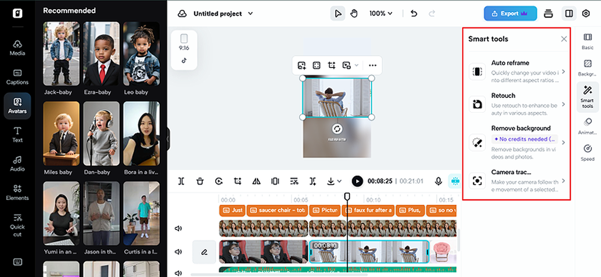 • Auto reframe: Automatically reframes your shot according to aspect ratio and focal point—ideal for various platforms and visual aesthetics between markets.