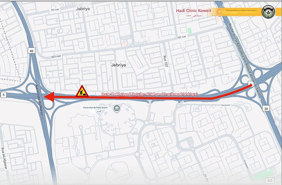 KUWAIT CITY, Oct 5: The General Administration of Traffic has announced a complete closure of the left lane on the expressway of Sheikh Zayed bin Sultan Al Nahyan Road (near the Fifth Roundabout) opposite the Jabriya area. The closure will extend from the intersection with King Abdulaziz bin Abdul Rahman Al Saud Road (Fahaheel Expressway) to the intersection with Maghrib Expressway.