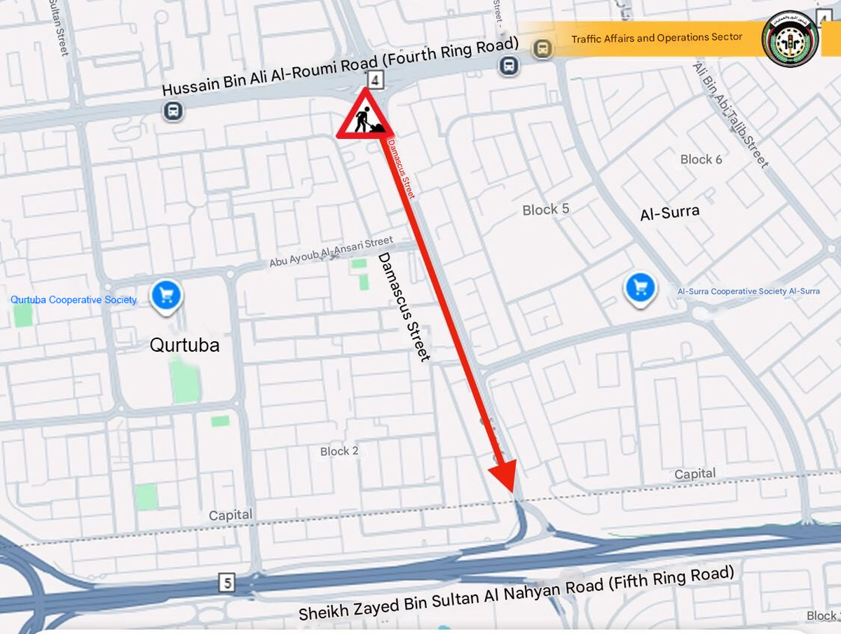 KUWAIT CITY, Aug 28: The General Directorate of Traffic has announced the temporary closure of Damascus Street in the direction of the Qurtuba area. The closure will extend from the street’s entrance at Hussein bin Ali Al-Roumi Road (Fourth Ring Road) to its exit at Sheikh Zayed bin Sultan Al Nahyan Road (Fifth Ring Road). The closure will be in effect from Thursday, August 28, 2025, until the early hours of Sunday, August 31, 2025.