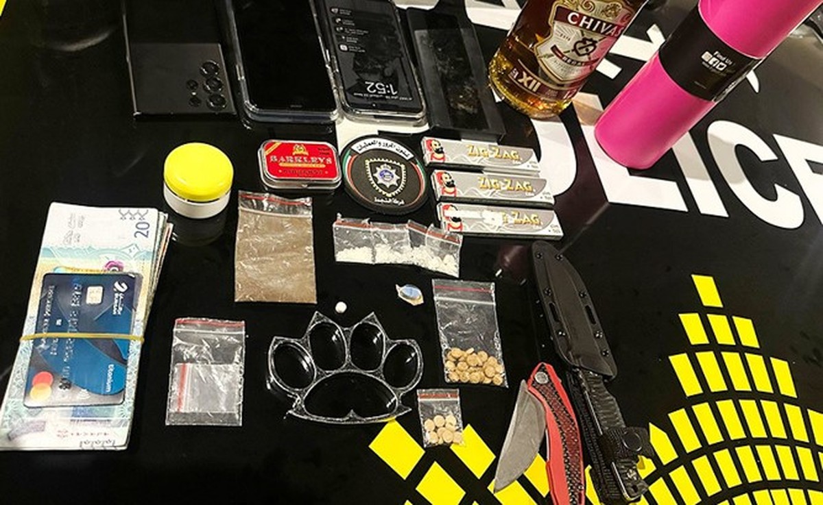Upon inspection, officers discovered that the driver was in an abnormal condition. A search of the vehicle uncovered a switchblade, a sharp knife, a metal box ring, and several types of narcotic substances — including a bag of crystal meth, three small bags of heroin, and approximately 25 Captagon pills. They also found a quantity of cash, rolling papers, and a bottle containing hashish-flavored electronic shisha liquid.