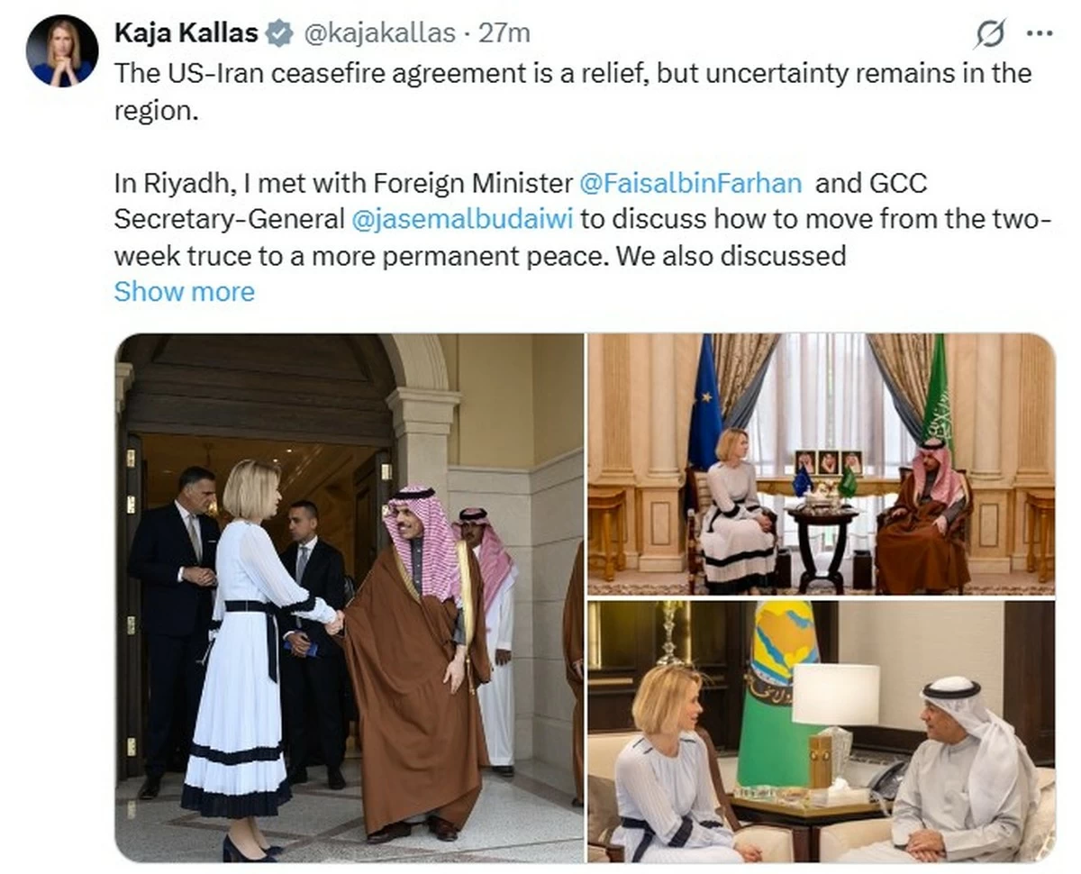 RIYADH, April 8: EU foreign policy chief Kaja Kallas said the US-Iran ceasefire is a relief, but cautioned that uncertainty persists across the Arab region. In a post on X, she said she met Saudi Foreign Minister Prince Faisal bin Farhan Al Saud and GCC Secretary-General Jasem Mohamed Albudaiwi in Riyadh to discuss efforts to move from the two-week truce toward a more lasting peace, alongside broader regional security issues. Kallas added that the crisis highlights the need for a stronger EU–Gulf partnership, including closer security and defence cooperation.