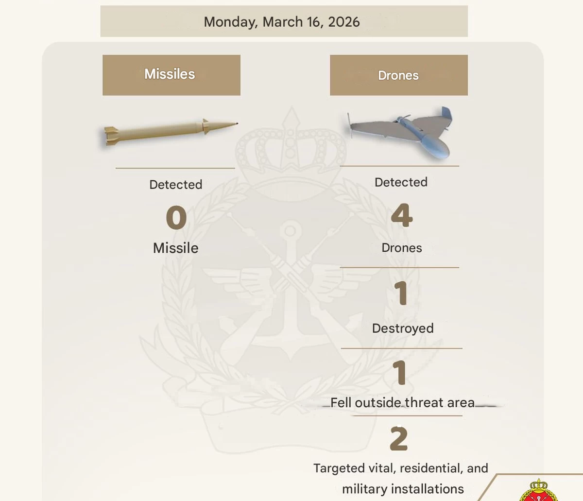 KUWAIT CITY, Mar 16: The Kuwaiti Ministry of Defense, through its official spokesman Colonel Saud Abdulaziz Al-Otaibi, reported that Kuwait’s air defense system detected four hostile drones entering the country’s airspace over the past 24 hours. One drone was successfully destroyed, another fell outside the threat zone without posing danger, and two additional drones landed in the northern region. No injuries or material damage were reported. The Kuwaiti Armed Forces emphasized their full readiness to safeguard national security and uphold the country’s sovereignty.
