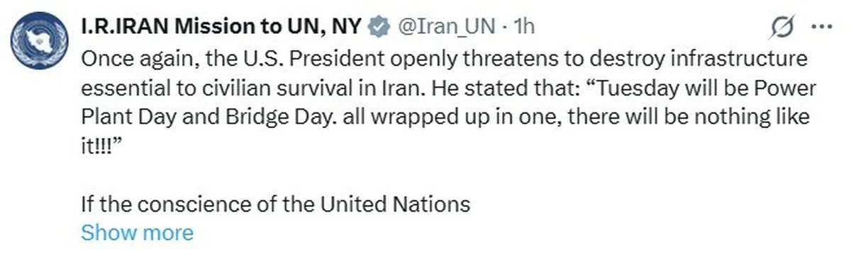 In a statement posted on X, Iran’s mission to the United Nations said the threats to target civilian infrastructure constitute “a direct and public incitement to terrorise civilians” and represent clear evidence of intent to commit war crimes.
