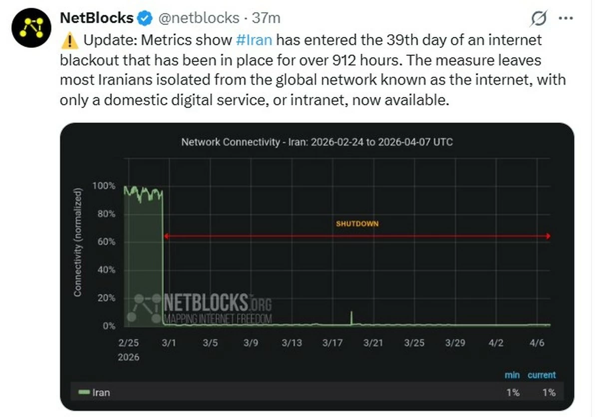 TEHRAN, Apr 7: Iran’s nationwide internet disruption has entered its 39th consecutive day, with connectivity restrictions now exceeding 900 hours, according to internet monitoring group NetBlocks.