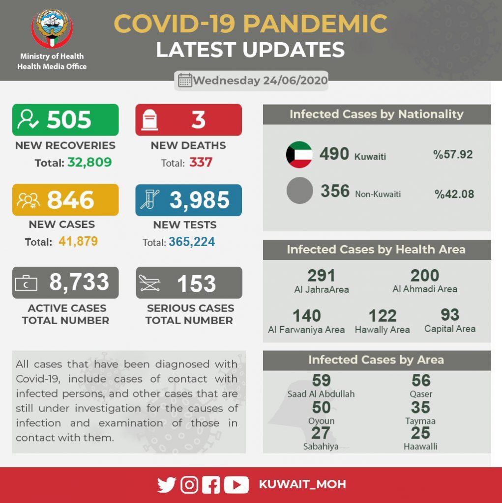 KUWAIT CITY, Jun 24: The Kuwait Ministry of Health announced 846 new coronavirus (COVID-19) infections in the last 24 hours, bringing the total to 41,879 while 3 deaths were reported as well bringing the fatalities' toll up to 337.