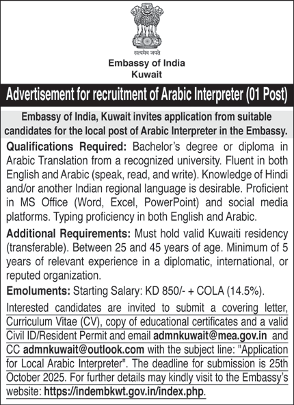 Job Vacancy At the Indian Embassy in Kuwait for Arabic Interpreter