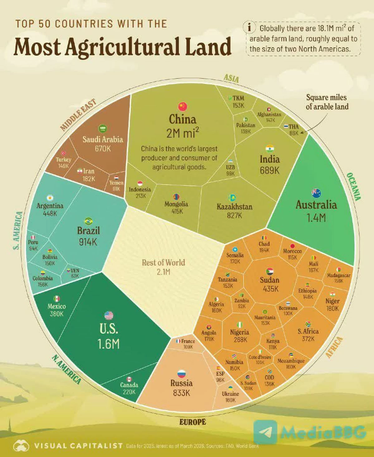 China tops the list with around two million square miles of farmland, maintaining its position as both the largest holder of agricultural land and the leading producer and consumer of agricultural commodities. The United States follows with roughly 1.6 million square miles, while Australia ranks third with about 1.4 million.