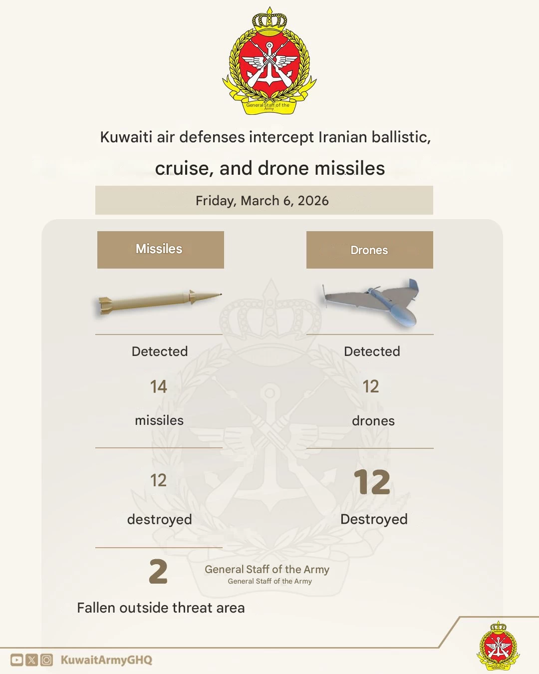 KUWAIT CITY, March 7: The Kuwait Armed Forces said its air defense systems successfully intercepted and destroyed a wave of missiles and drones launched from Iran early Friday, preventing major damage or casualties.