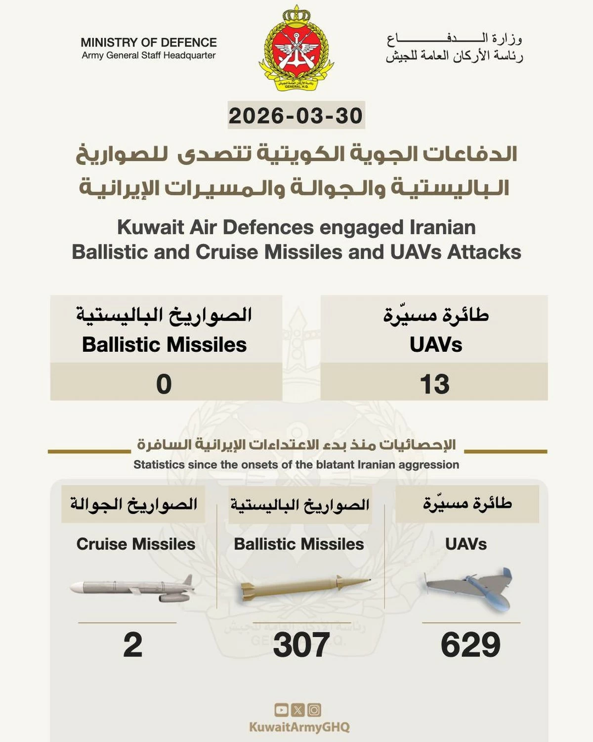 KUWAIT CITY, Mar 30: Kuwait’s Armed Forces said they intercepted and dealt with 13 hostile drones over the past 24 hours, as part of ongoing efforts to secure the country’s airspace.