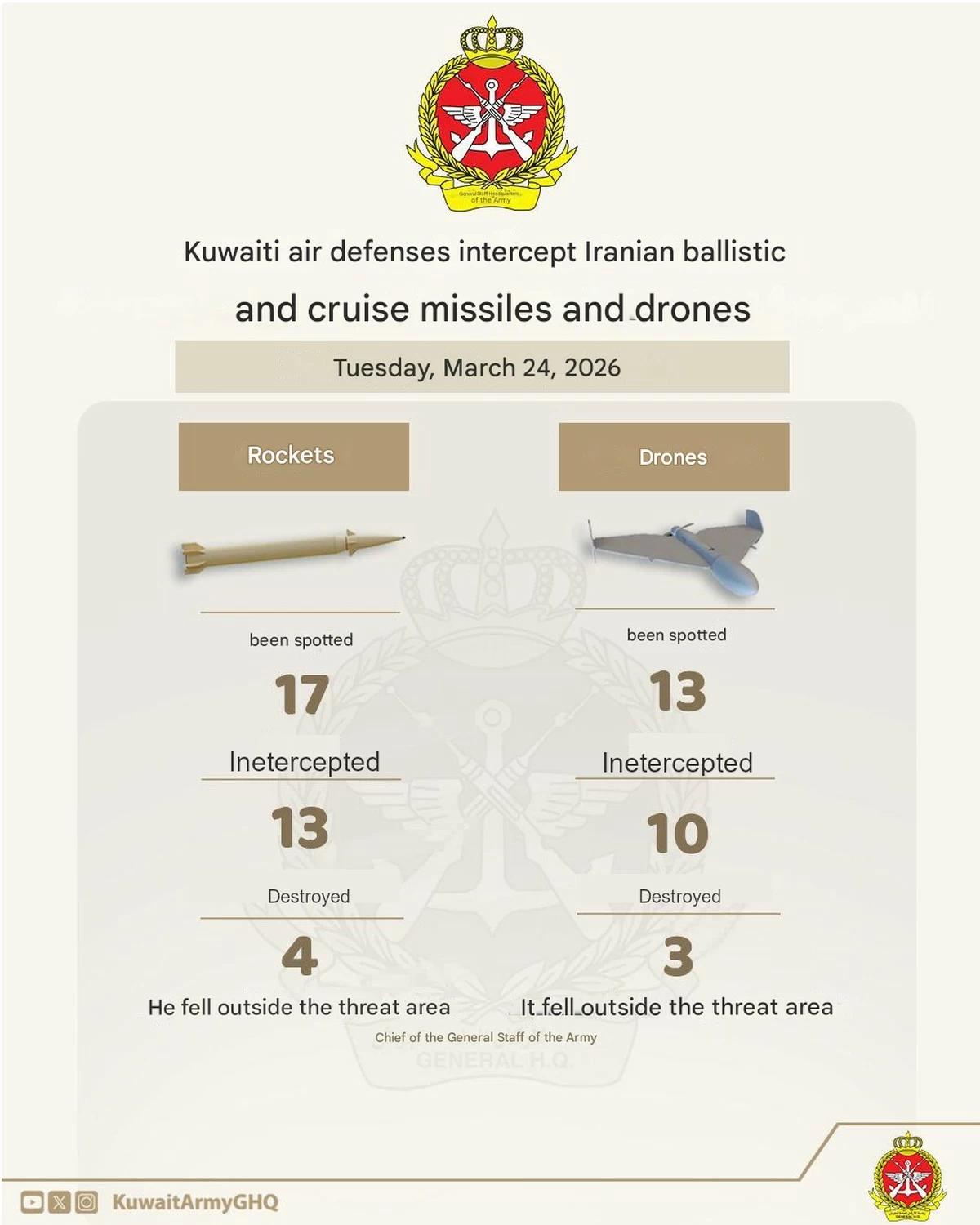 KUWAIT CITY, Mar 24: The Kuwait Ministry of Defense announced that its air defense systems detected 17 hostile ballistic missiles and 13 drones within Kuwaiti airspace over the past 24 hours, amid escalating regional tensions.