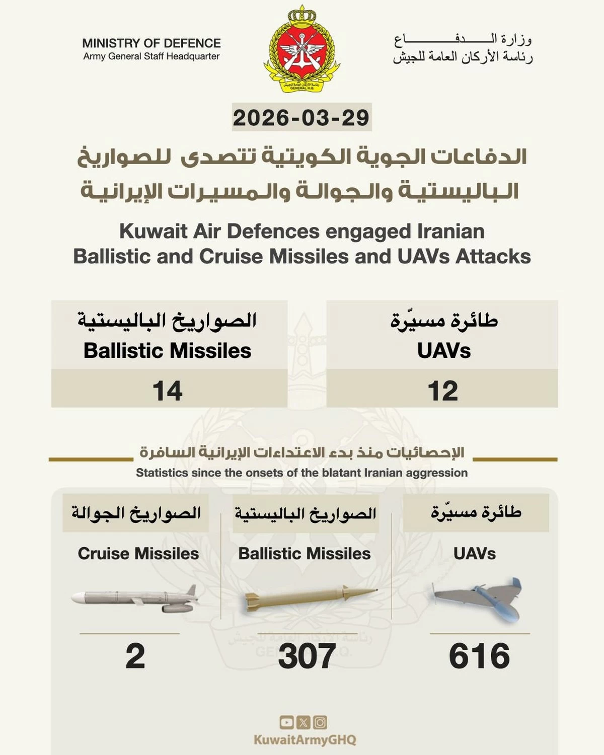 KUWAIT CITY, Mar 29: Kuwait’s Ministry of Defense announced that air defense systems successfully detected and intercepted 14 hostile ballistic missiles and 12 drones over the past 24 hours, according to official spokesperson Brigadier General Saud Al-Otaibi.