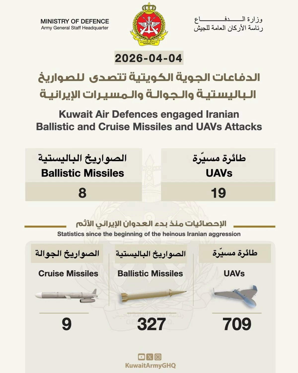KUWAIT CITY, Apr 4: The Ministry of Defense announced that the Armed Forces successfully monitored and responded to aerial threats over the past 24 hours, intercepting eight ballistic missiles and 19 hostile drones within Kuwaiti airspace without any reported casualties or material damage.
