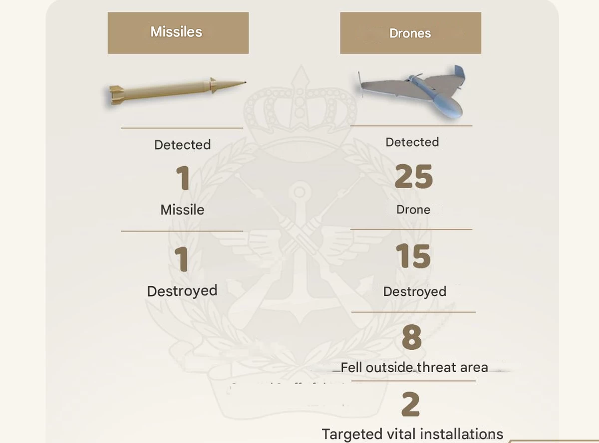 The attack triggered a fire at the facility, which was swiftly brought under control by specialized emergency teams, with no casualties reported. Colonel Al-Atwan added that eight drones crashed without causing any damage.