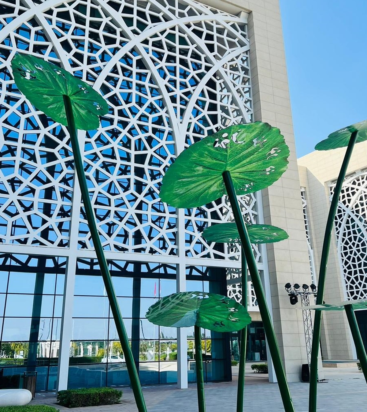 The installation features branches up to four meters long, inspired by the lotus plant, arranged into a semicircle. The word “Nour” (light) is carved into the leaf branches, creating a visual effect that emphasizes the presence of light and its spiritual significance.