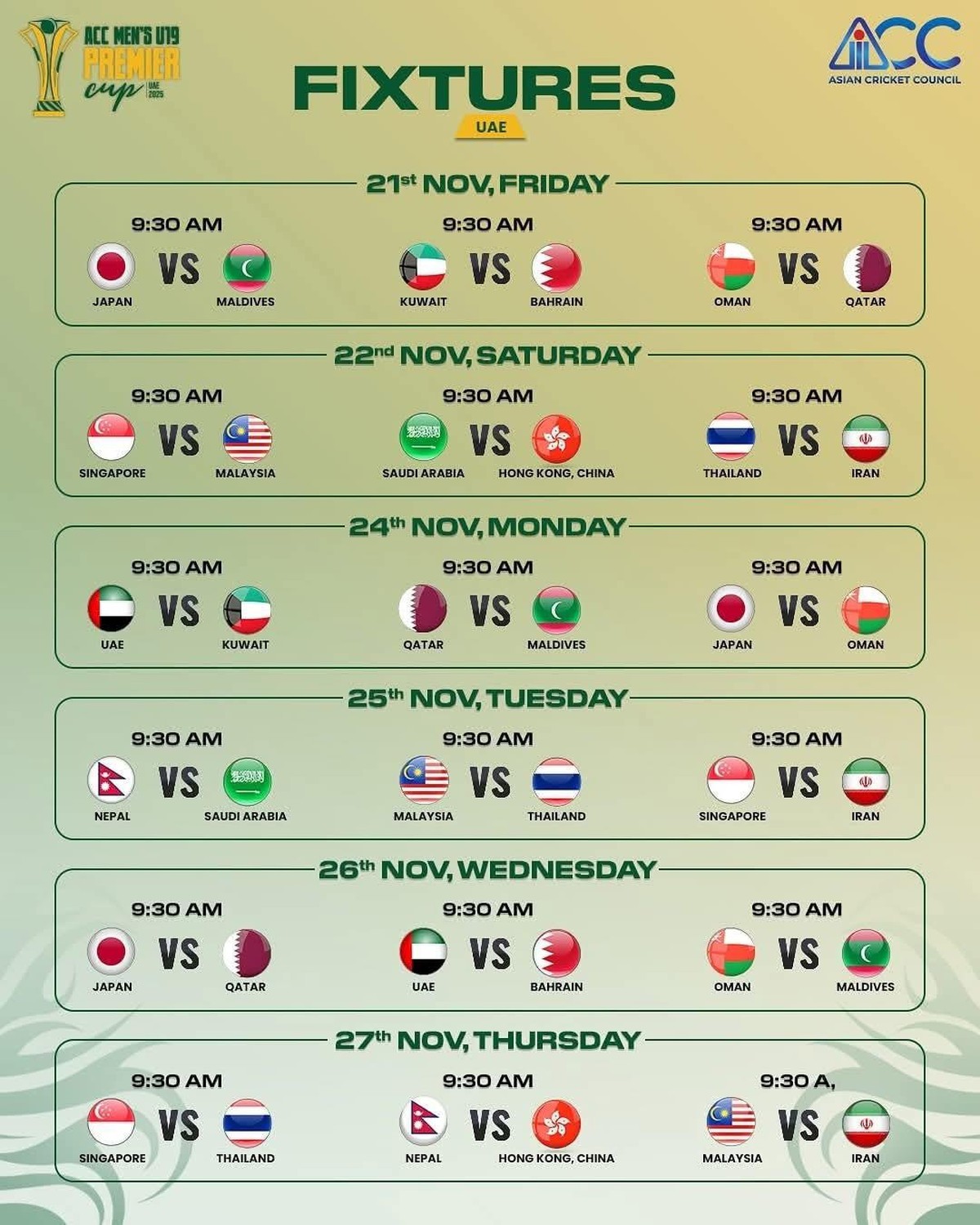 KUWAIT CITY, Nov 20: The ACC Men’s U19 Premier Cup is a youth cricket tournament organized by the Asian Cricket Council (ACC) in a 50-over format. It serves as a qualifier for the ACC U19 Asia Cup. The 2025 edition will be held in the UAE from November 21 to December 1, featuring 14 teams. Nepal won the previous 2023 edition, defeating the UAE in the final. The tournament showcases emerging cricket talent from across Asia.