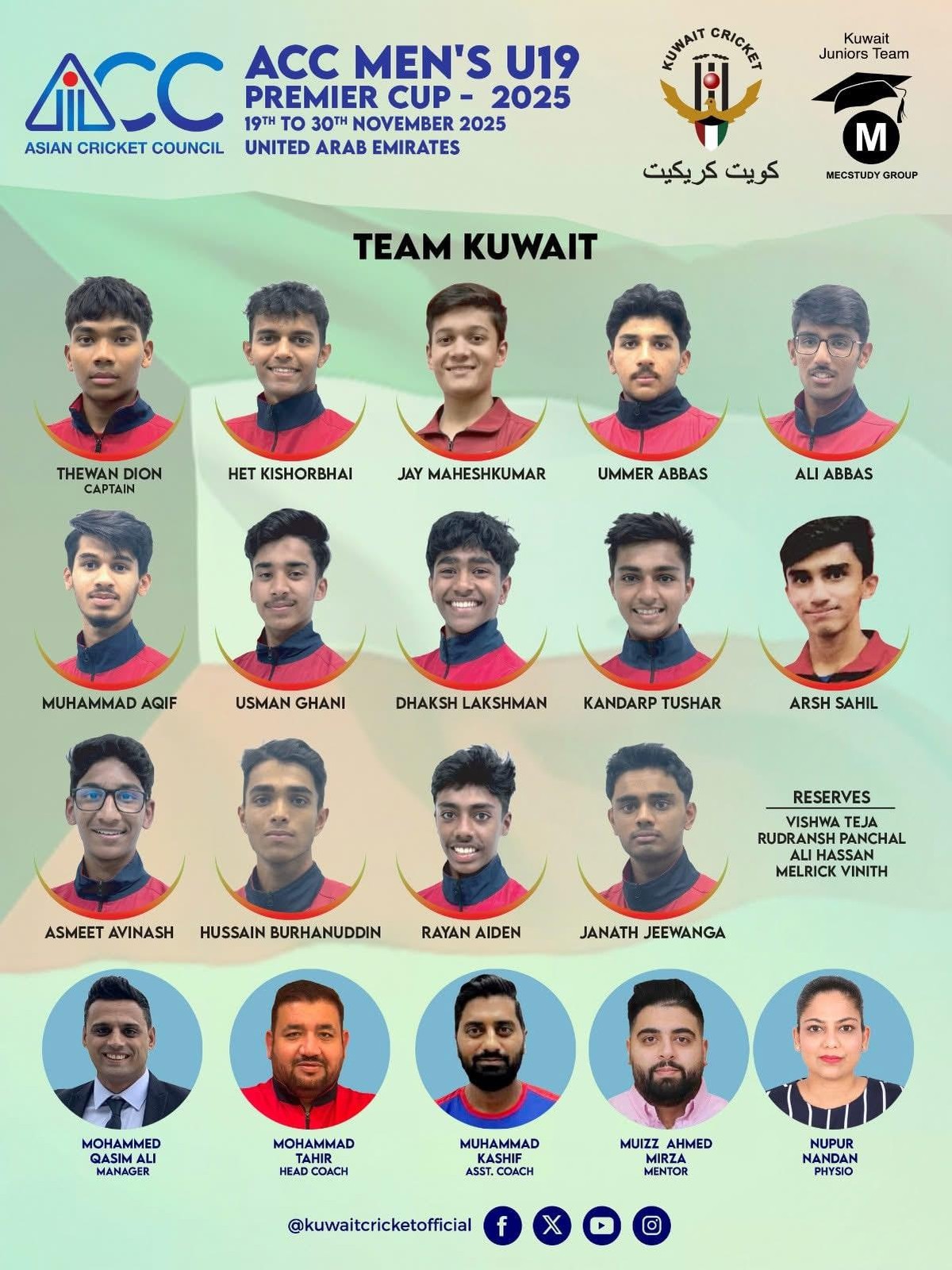 Kuwait Cricket proudly announces the squad powered by MEC Study Group for the ACC Men’s U19 Premier Cup 2025 in the UAE from 19–30 November.