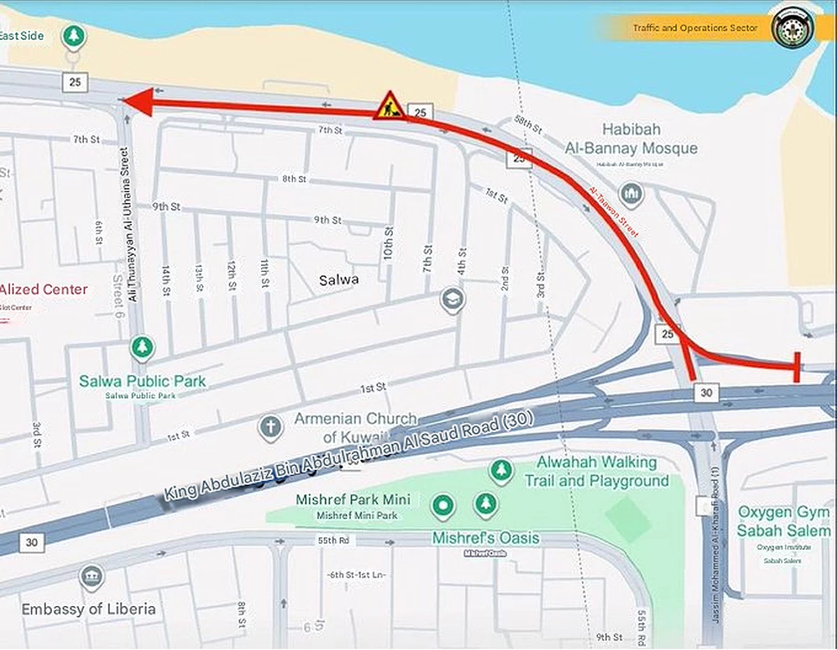 KUWAIT CITY, Dec 26: The General Traffic Department has announced a partial closure of Al-Taawon Street, with one and a half lanes closed to traffic for vehicles coming from Jassim Al-Kharafi Road (Sixth Ring Road) and King Abdulaziz bin Abdulrahman Al Saud Road (Fahaheel Road) up to the intersection with Ali Thunayyan Al-Uthaina Street, in the direction of Al-Bidaa Roundabout.