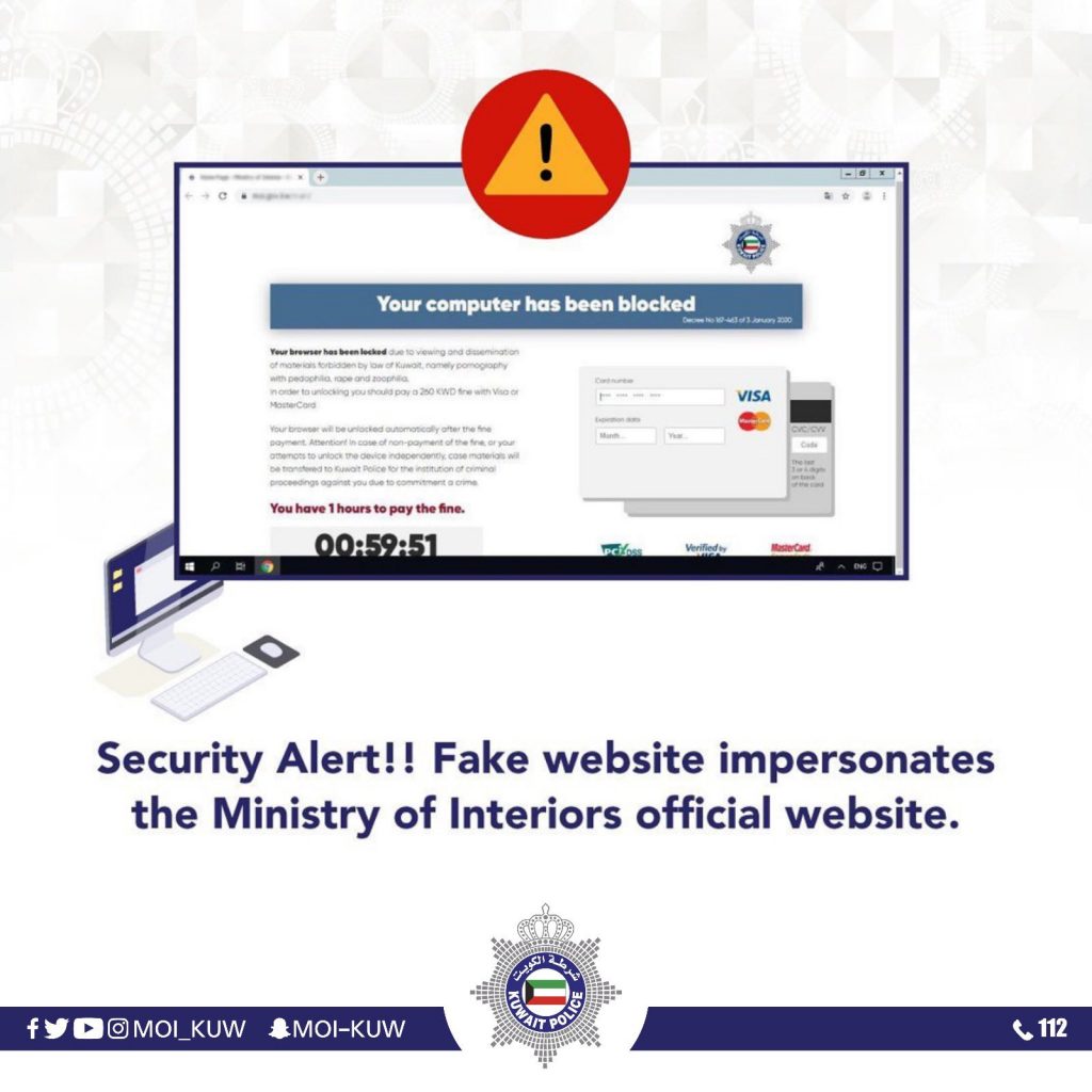 KUWAIT CITY, Aug 22: The Ministry of Interior has warned citizens and residents to beware of gangs who impersonate the ministry personnel on fake website and request for bank data under the pretext of lifting the ban on them for alleged violations committed by them. In a statement, the Ministry of Interior has asked the public not to respond to such fraudulent campaigns aimed at stealing private bank data