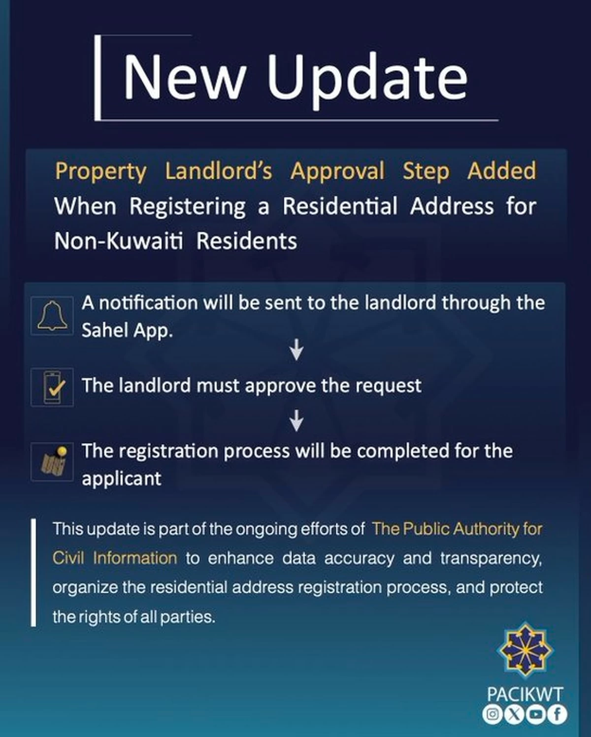PACI said the update aims to enhance the accuracy of residential data and promote transparency in address registration procedures, helping ensure reliable information while safeguarding the rights of all parties involved.