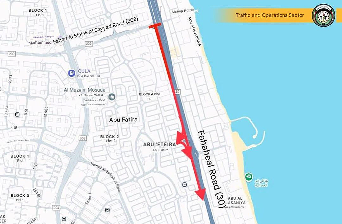 According to the department, the emergency lane, the slow right lane, and half of the middle lane will be closed, along with the entrance and exit routes to the Abu Futaira area. The closure extends from the Abu Hasaniya and Abu Futaira bridge to just before the Al-Aqila and Fintas roundabouts, heading south.