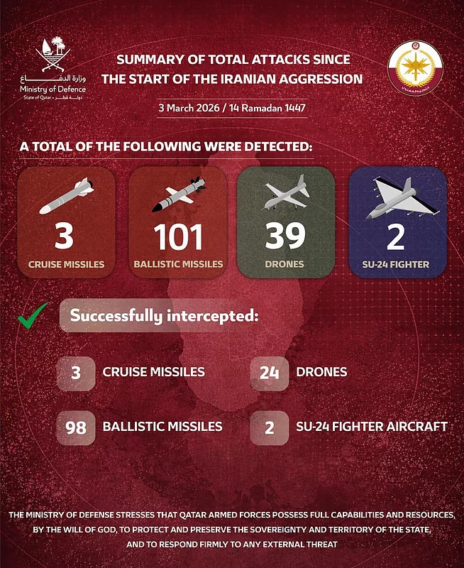 DOHA, Mar 3: Qatar's Ministry of Defence has released a summary of Iranian attacks since March 3, highlighting successful interceptions amid the ongoing aggression.