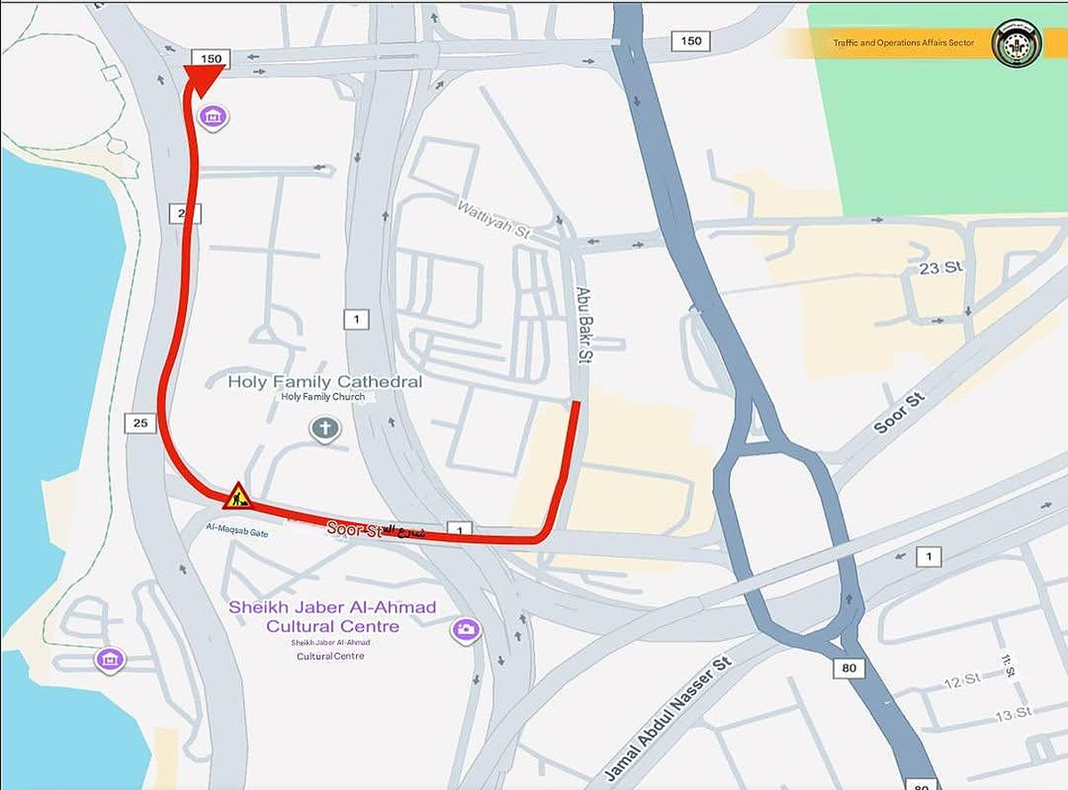 KUWAIT CITY, Oct 8: The General Traffic Department has announced the closure of the Abu Bakr Al-Siddiq Street intersection in the direction leading to the Arabian Gulf Street intersection (Al-Maqsab Gate), extending up to the intersection of Abu Bakr Street with the National Assembly.
