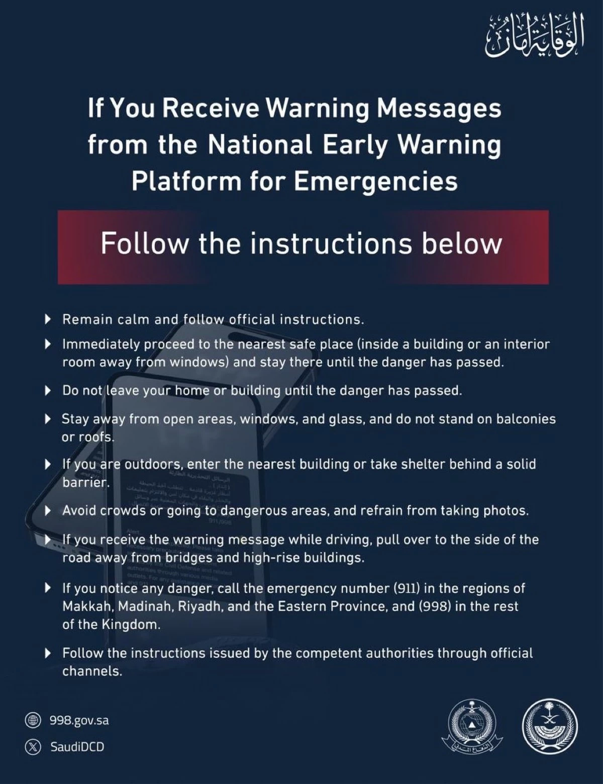 The Saudi Civil Defense reiterated the importance of following updates issued through official channels including its official platforms such as 998.gov.sa, to ensure public safety during emergency situations.