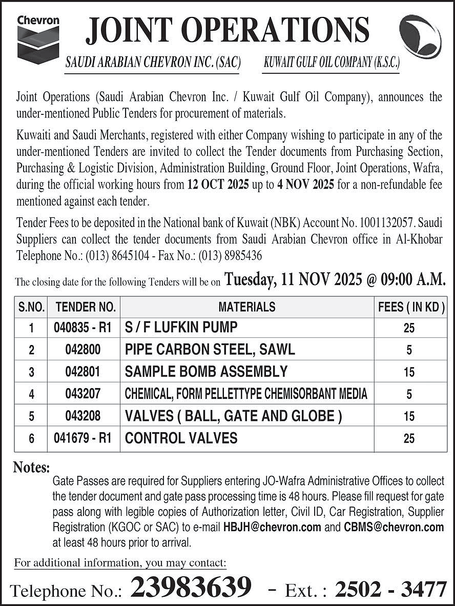 Saudi Arabian Chevron Tender for the Procurement of materials - Closing date 11th Nov 2025