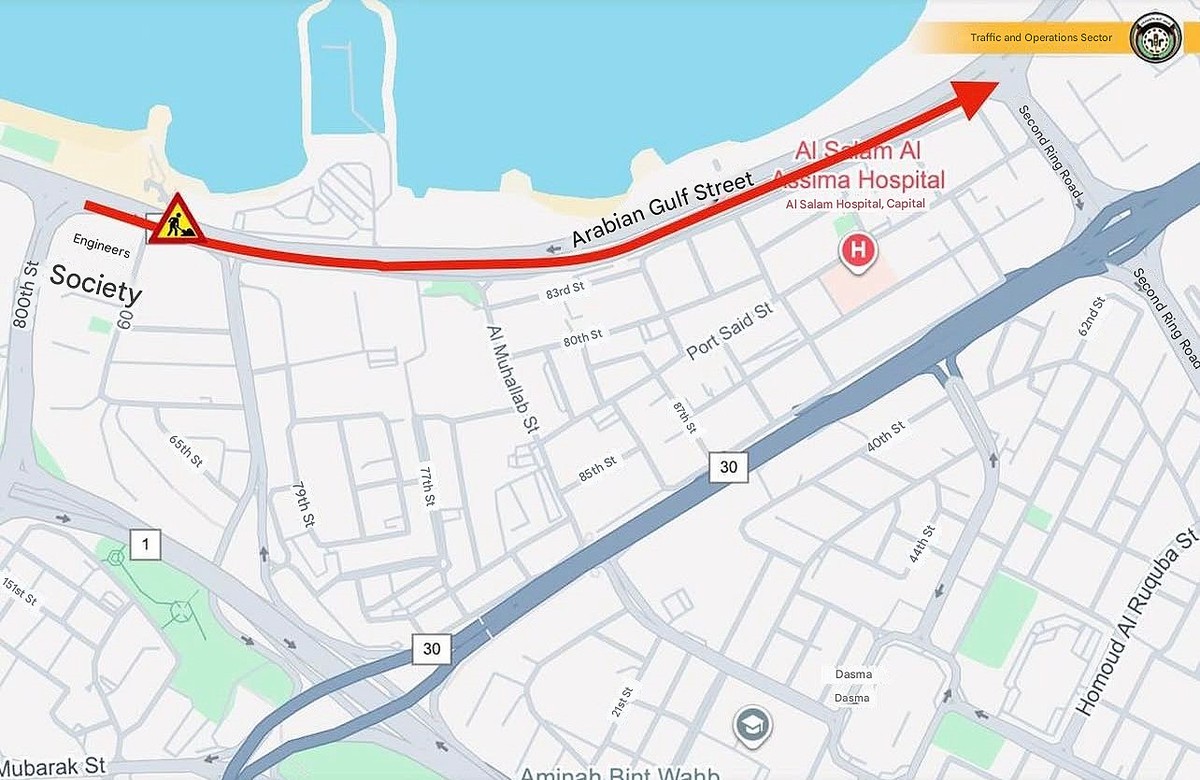 KUWAIT CITY, Nov 16: The General Directorate of Traffic has announced that the left lane on Arabian Gulf Street will be closed starting Sunday, November 16, 2025, as part of routine road maintenance operations.