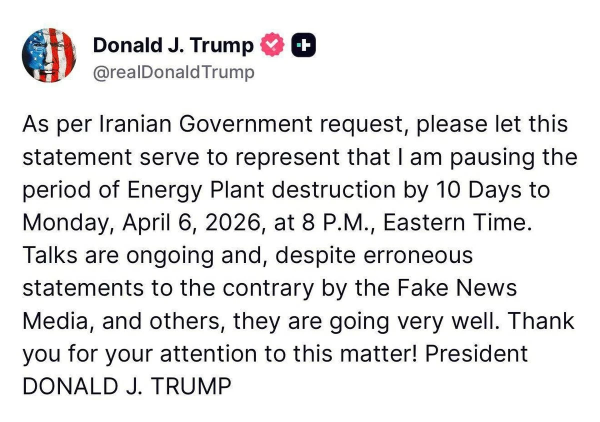 In a statement posted on his official social media account, Trump said the suspension of energy plant strikes would last for 10 days, until April 6 at 8 p.m. Eastern Time. He indicated that discussions between the two sides are ongoing and progressing positively.