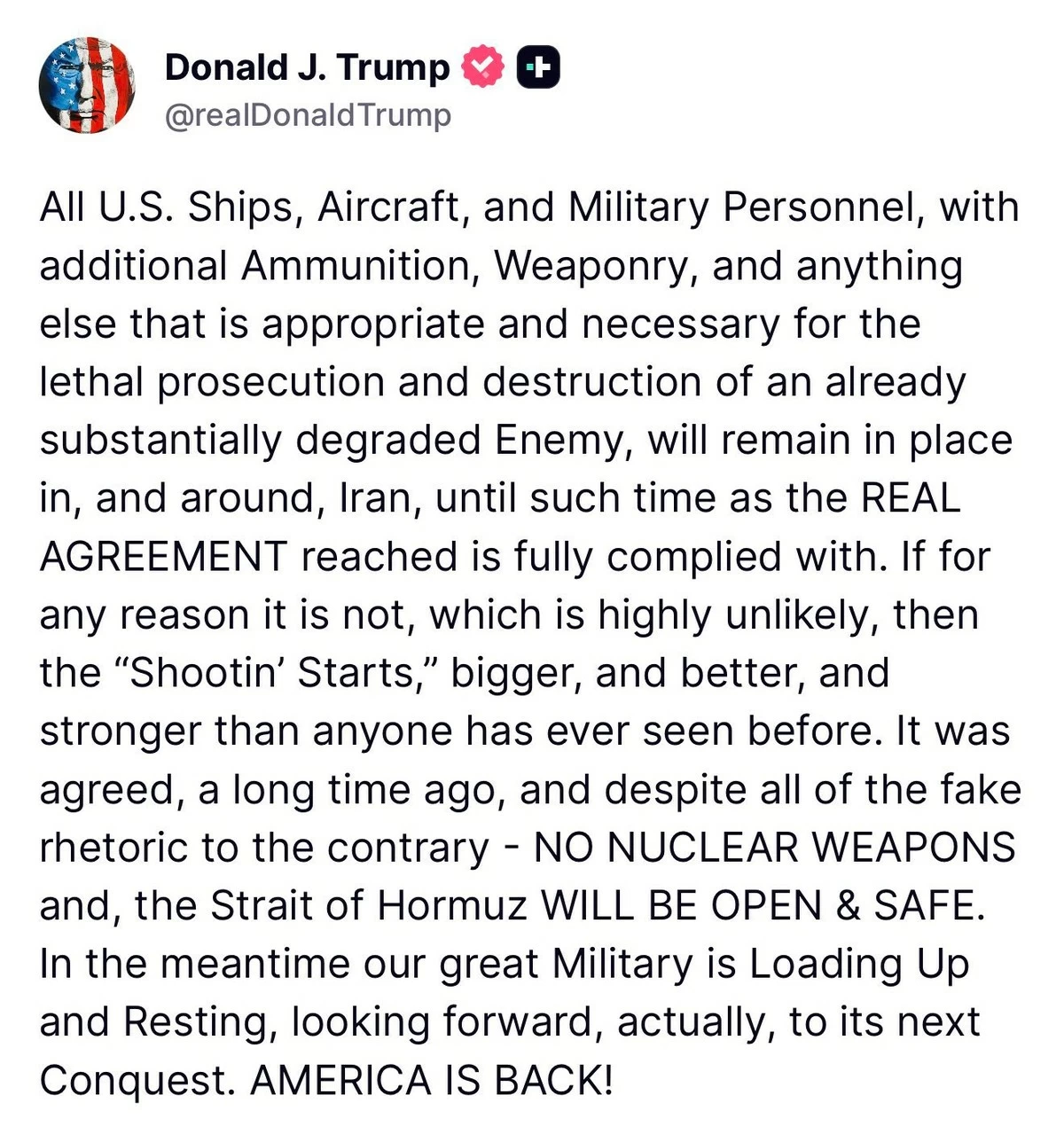 In a post on the social platform Truth Social, Trump stated that U.S. ships, aircraft, and personnel—along with additional weapons and ammunition—would stay in position while compliance is monitored.