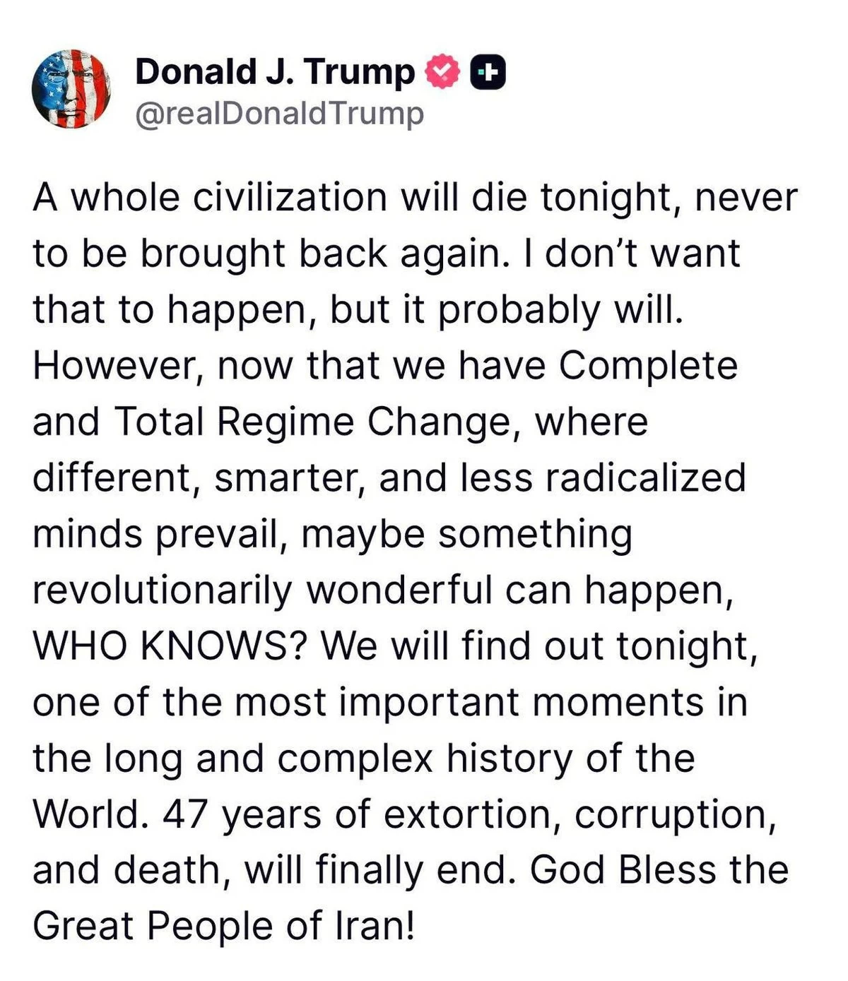 In a separate message, Trump said, “We will find out tonight, one of the most important moments in the long and complex history of the world,” calling the situation “one of the most important moments” globally.