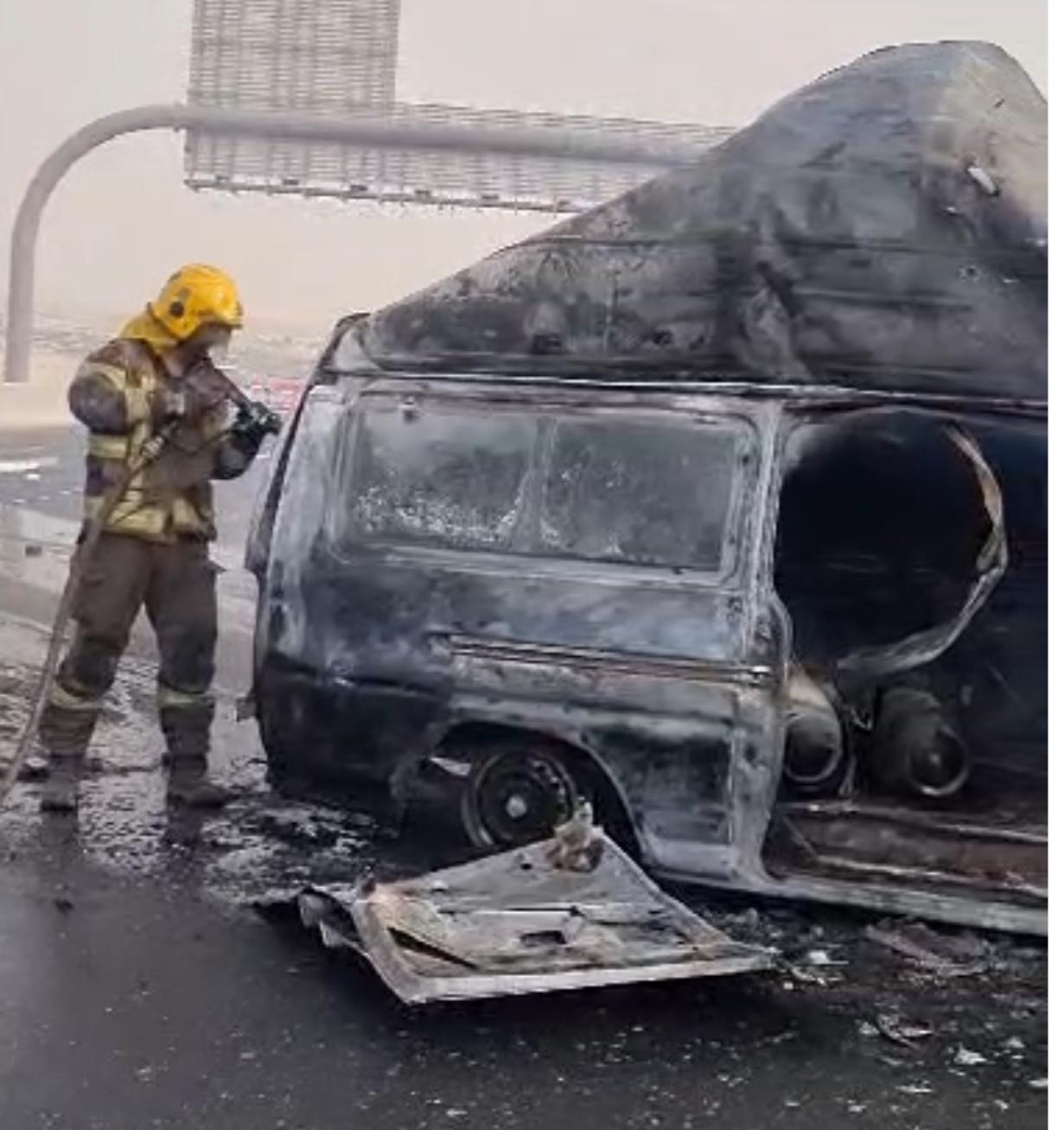 Kuwait City, Oct 31: Earlier today, the Jahra Industrial Area Fire Station responded to a vehicular collision involving a minibus on Salmi Road, which resulted in a fire engulfing the minibus. Tragically, this incident claimed the lives of two individuals, and the scene was subsequently handed over to the appropriate authorities.