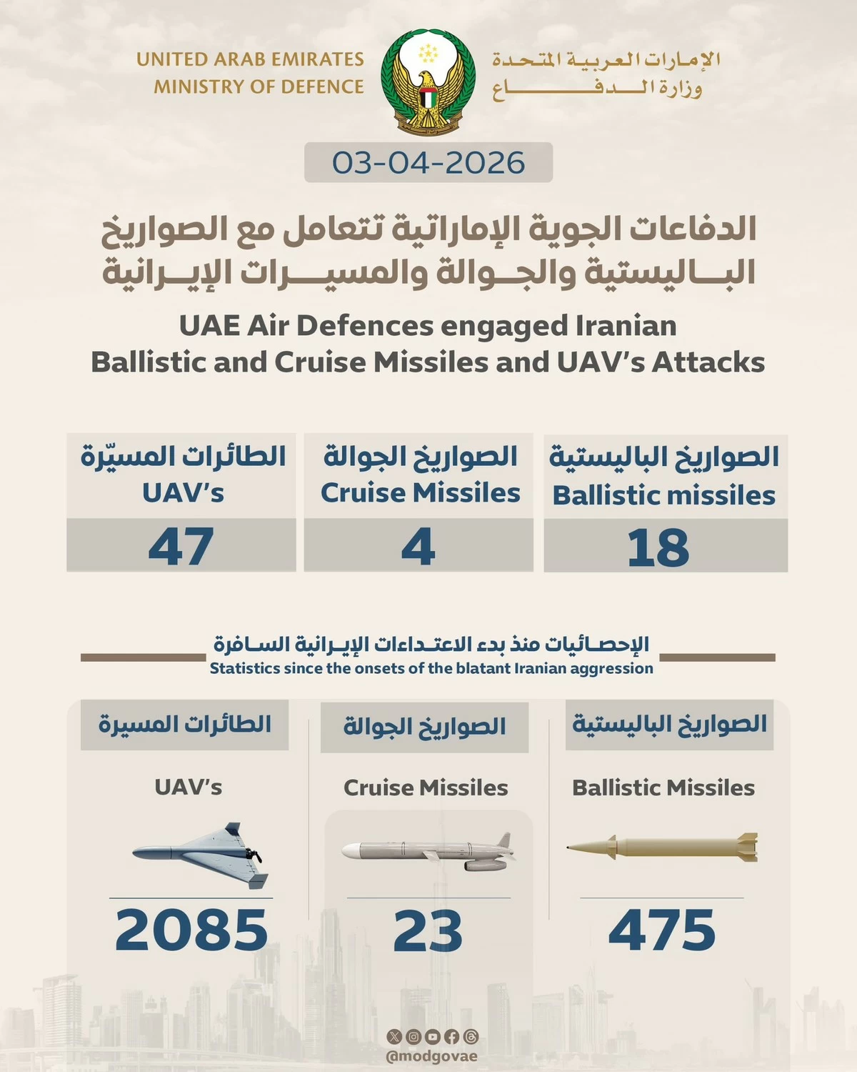 According to the ministry, since the start of the escalation, UAE forces have intercepted a total of 475 ballistic missiles, 23 cruise missiles, and 2,085 drones, while remaining on high alert to counter further threats and safeguard national security.