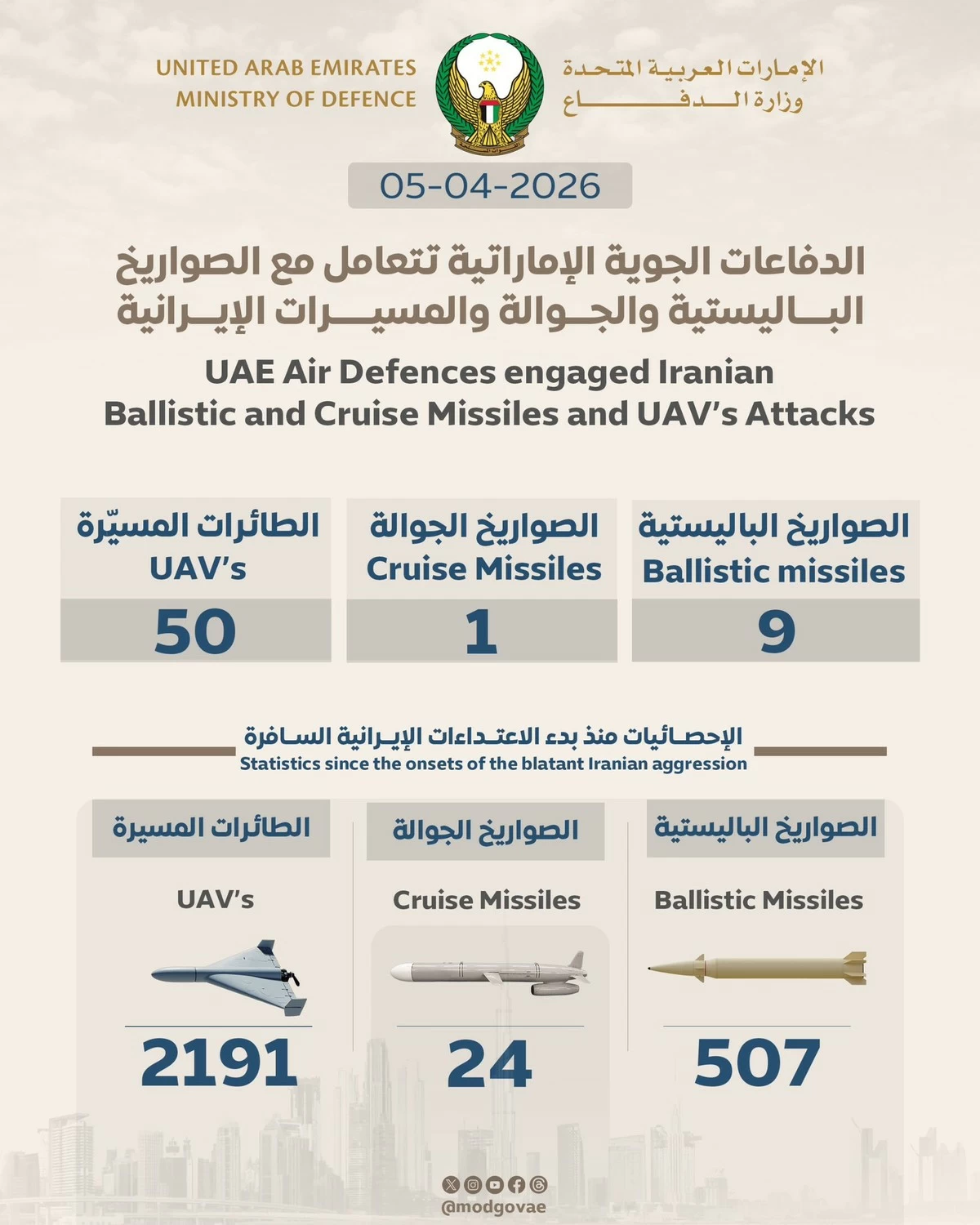 ABU DHABI, Apr 5: The UAE Ministry of Defence said its air defence systems successfully intercepted 9 ballistic missiles, 1 cruise missile, and 50 UAVs launched from Iran on April 5, 2026.