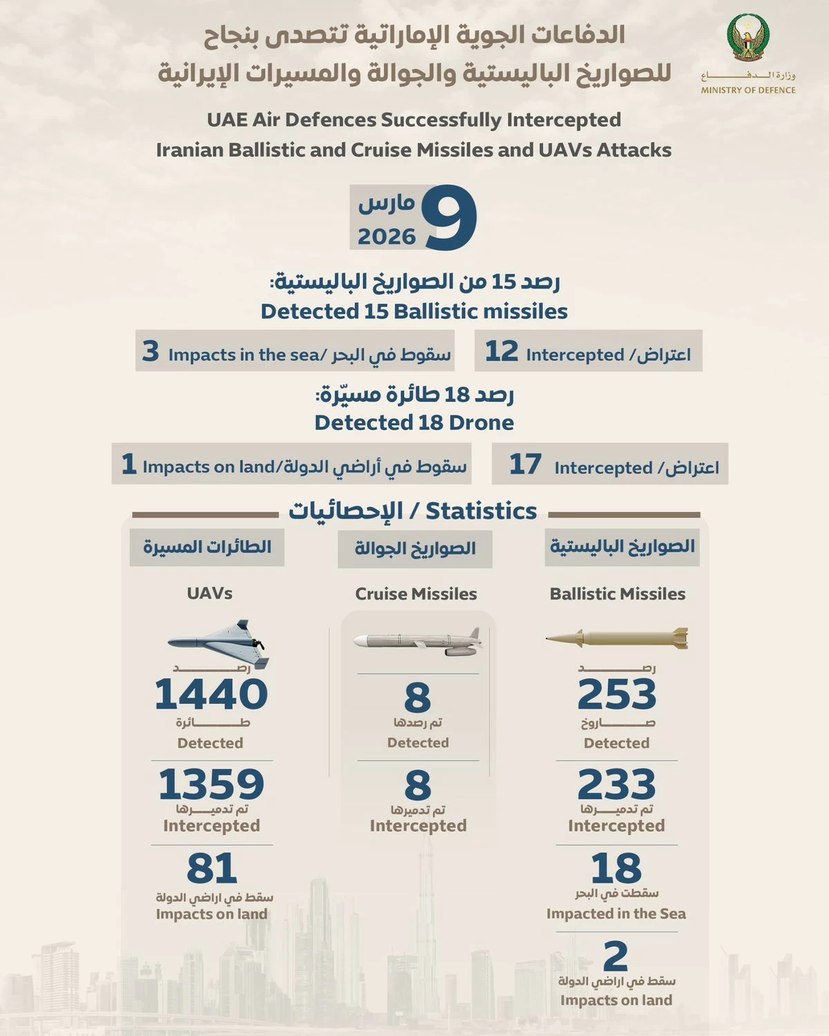Since the onset of what the ministry termed "blatant Iranian aggression," UAE defences have intercepted 233 of 253 ballistic missiles (with 18 falling into the sea and 2 striking territory), 1,359 of 1,440 Iranian drones (81 landing domestically), and all 8 detected cruise missiles.