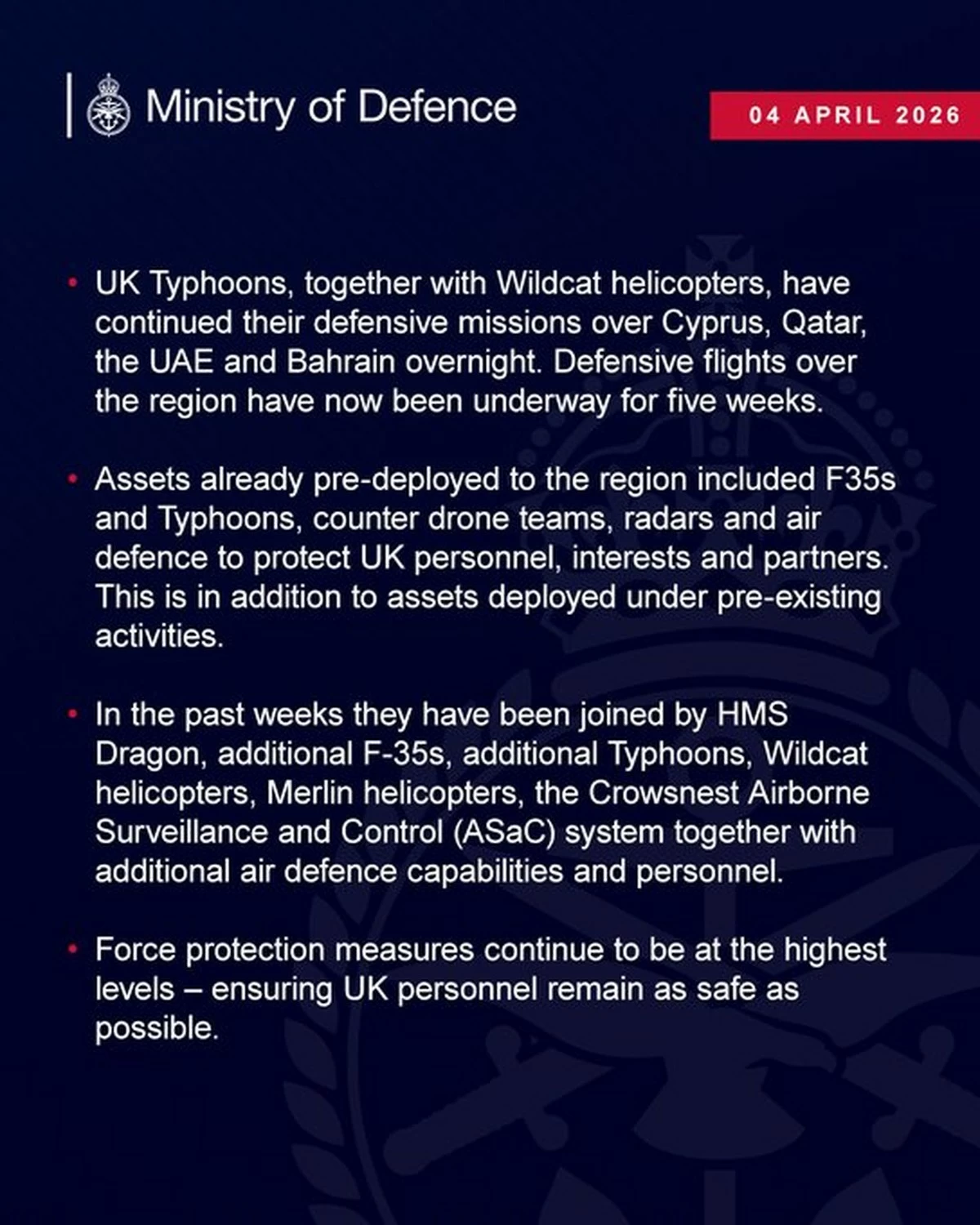 LONDON, April 4, 2026 — The UK Ministry of Defence said its military aircraft and naval assets have continued defensive operations across the Middle East, with fighter jets and helicopters conducting overnight missions over Cyprus, Qatar, the United Arab Emirates and Bahrain. The operations, now in their fifth week, involve Typhoon jets supported by Wildcat helicopters as part of efforts to safeguard UK personnel and regional partners.