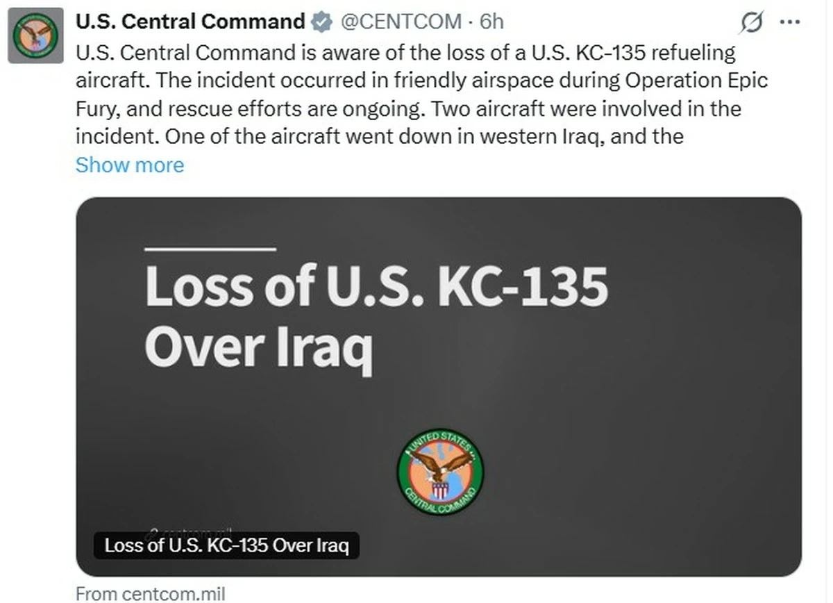 In a statement, the command said rescue operations were underway after a Boeing KC-135 Stratotanker refuelling aircraft went down in what it described as an incident that occurred in friendly airspace. A second aircraft involved in the event landed safely.