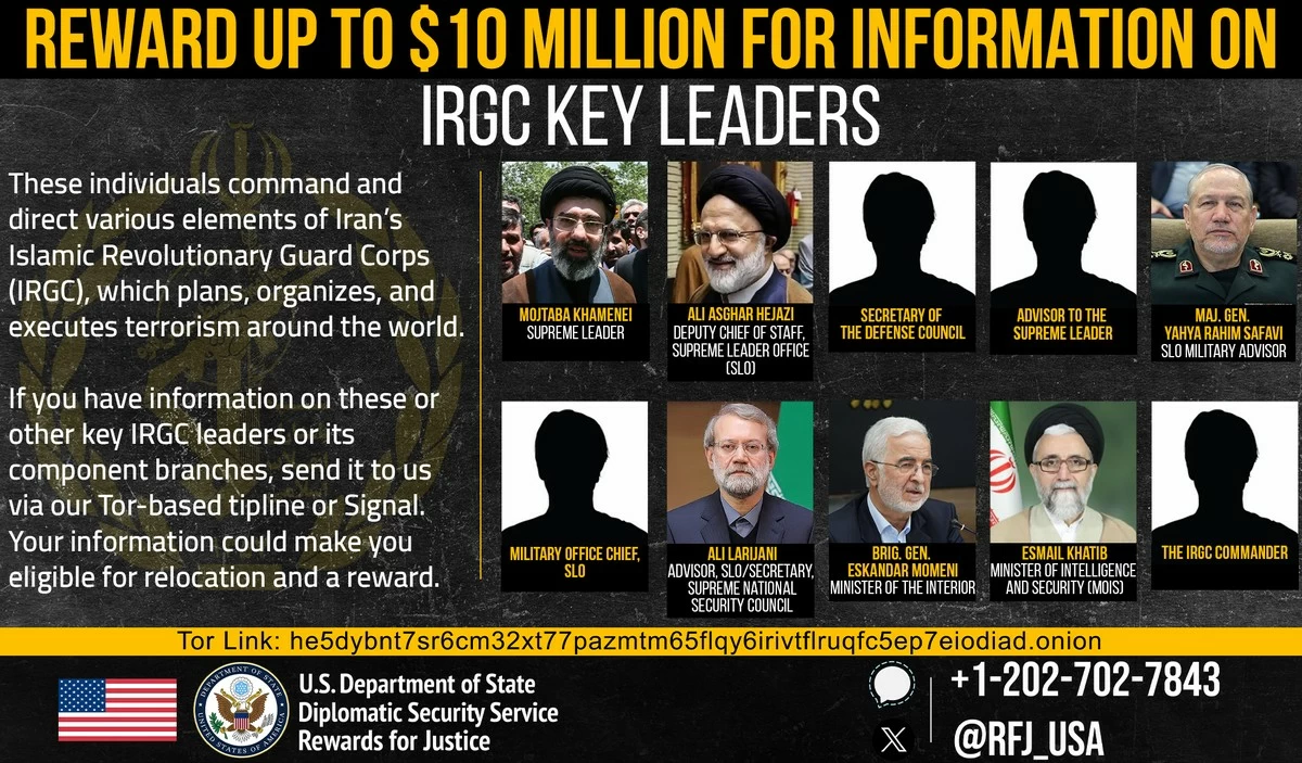 WASHINGTON, Mar 13: The U.S. State Department Diplomatic Security Service announced on Friday a $10 million reward for information on Iran’s new supreme leader, Mojtaba Khamenei, and other top Iranian officials.