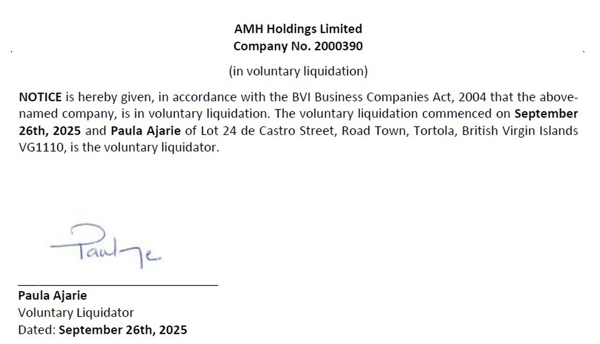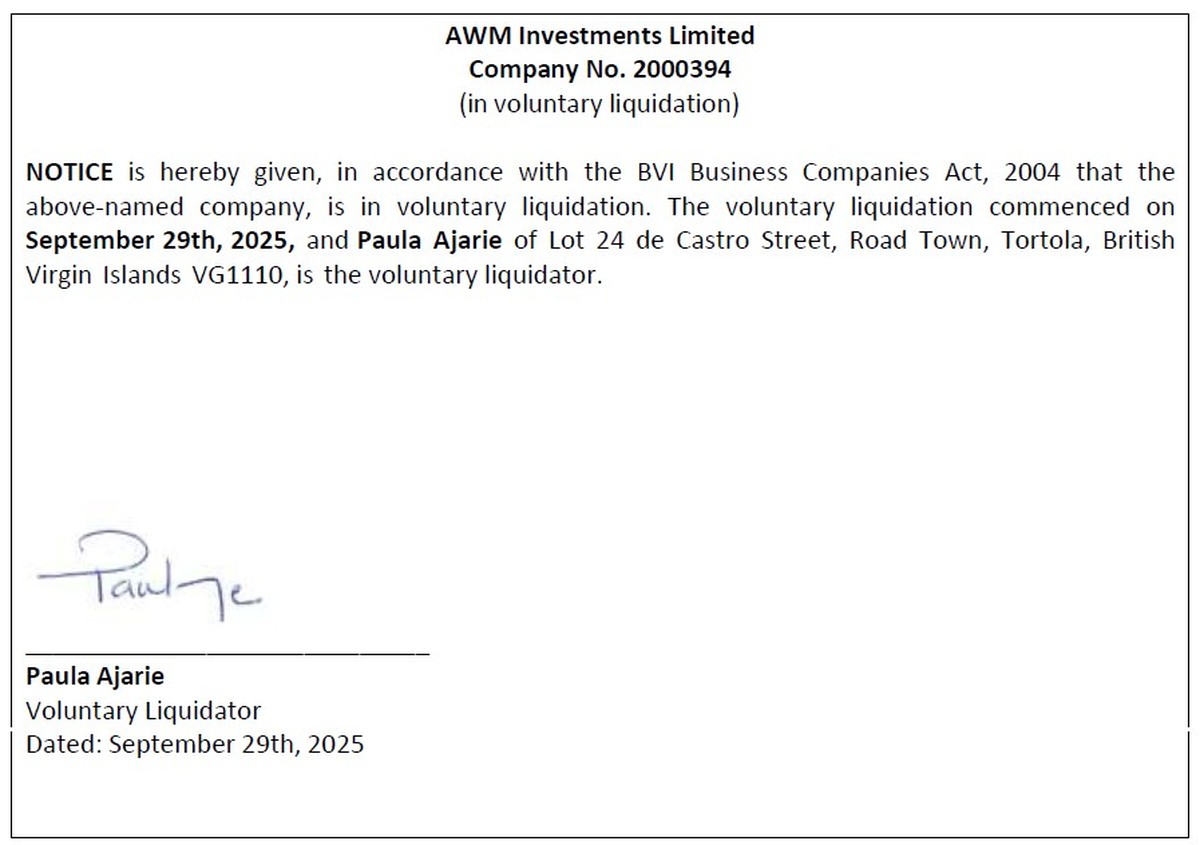 NOTICE is hereby given, in accordance with the BVI Business Companies Act, 2004 that the above-named company, is in voluntary liquidation. The voluntary liquidation commenced on September 29th, 2025, and Paula Ajarie of Lot 24 de Castro Street, Road Town, Tortola, British Virgin Islands VG1110, is the voluntary liquidator.